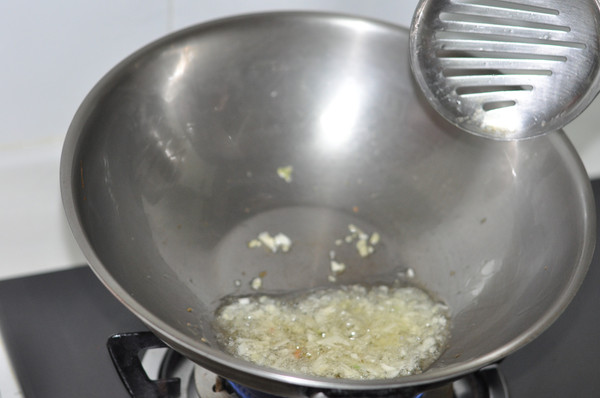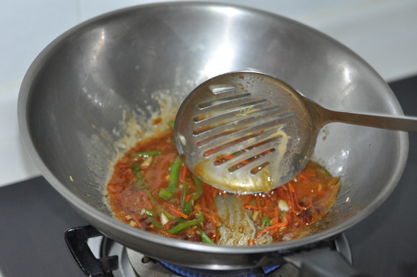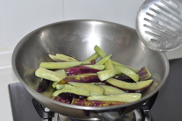 当感觉油温烫手时,将茄条放里迅速翻炒约一分钟出勺备用。