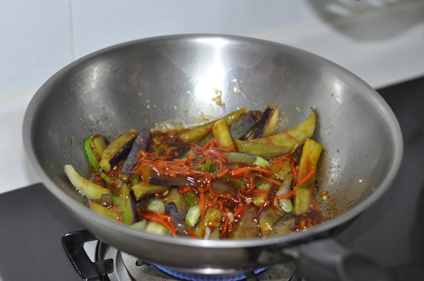 倒入茄条翻炒。关火后焖两分钟,用余温使茄汁入味。