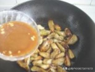 11.倒入茄子中,快速翻炒一下。