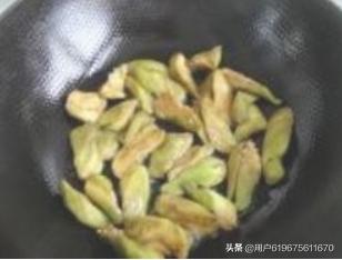 9.锅内入油,将茄子煎至两面金黄。