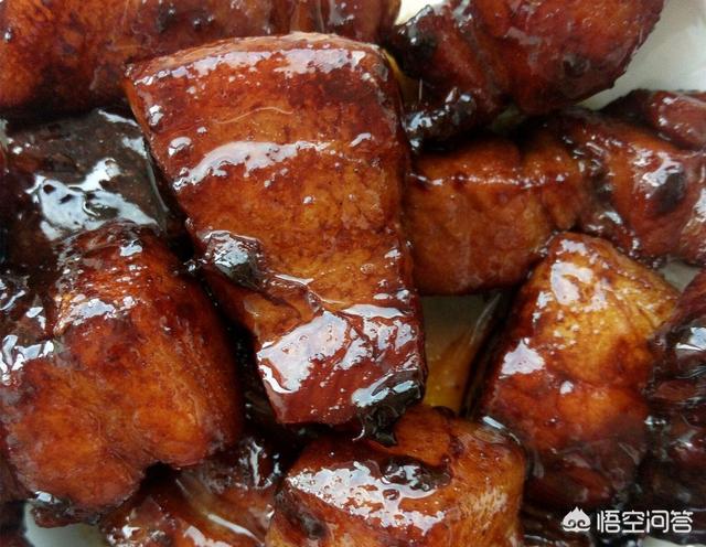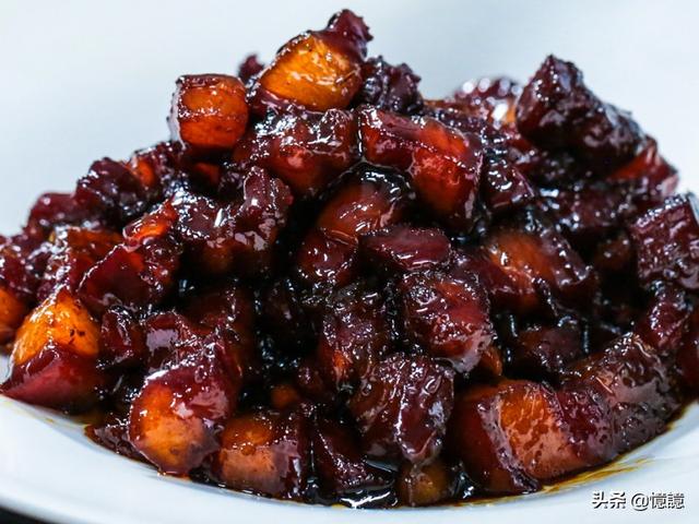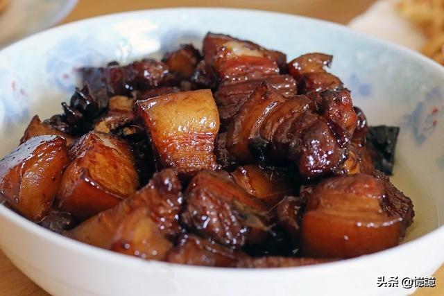 【食材】五花肉、老抽、八角、姜、胡椒粉、火麻油、冰糖、大蒜、盐 。【做法】1、准备材料,五花肉洗净,切成麻将块大小; 2、锅烧热放火麻油,爆香姜片大蒜花椒八角; 3、倒入五花肉翻炒至两面微焦,加入料酒或者白酒、酱油、冰糖; 4、转入砂锅加适量开水,慢火焖一个小时,要注意经常翻身,一方面均匀上色,另一方面避免猪皮粘锅。出锅之前撒点胡椒粉和盐就可以了。