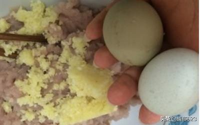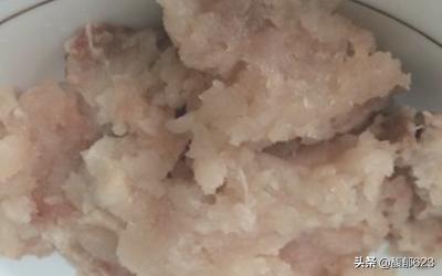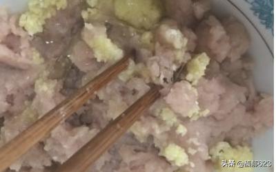 4.打好的丸子茸中加鸡蛋清1个,葱姜汁水淀粉2大勺,盐1克,花雕酒几滴。 5.用筷子顺一个方向搅打均匀。 6.用手抓一把丸子茸,在虎口处挤出丸子形状。