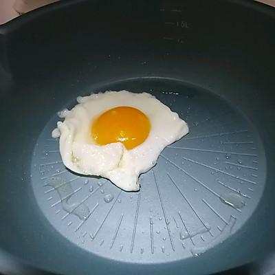 4、锅里放少许油,下入一个鸡蛋,喜欢吃熟一点的,可以多煎一会儿。煎好的鸡蛋盛出来备用。