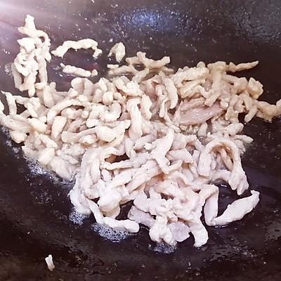 2、起锅烧油,下入肉丝煸炒至变色,断生,盛出来备用。