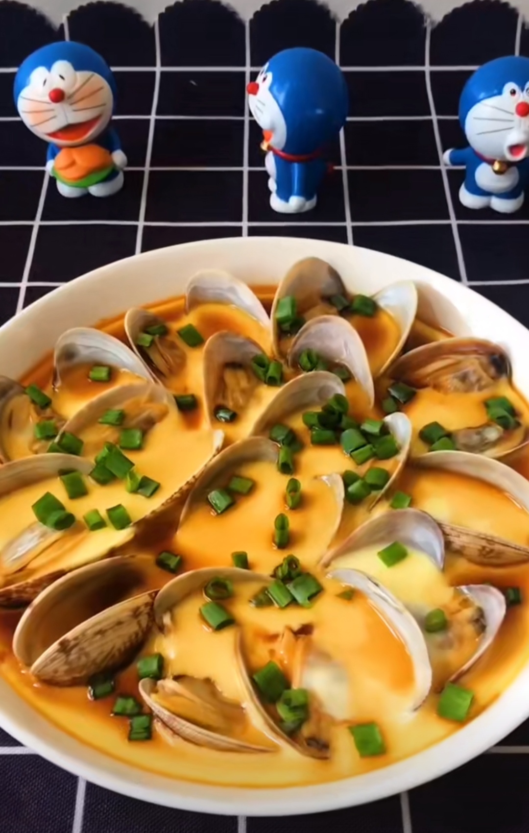花甲蒸蛋,洗干净的花甲焯水后摆盘淋上搅拌均匀的蛋液上锅蒸8分钟后,加两勺生抽一把葱花,好吃又营养