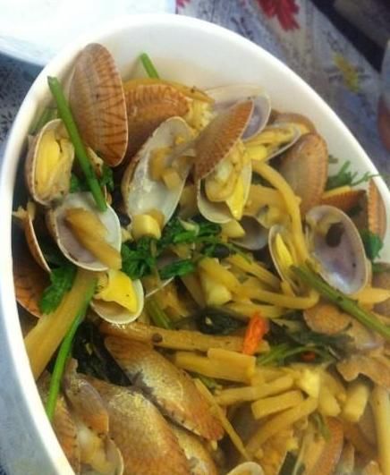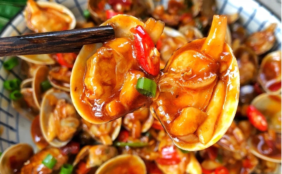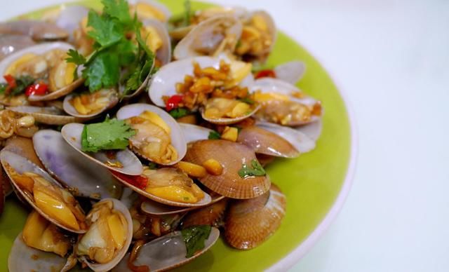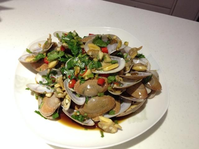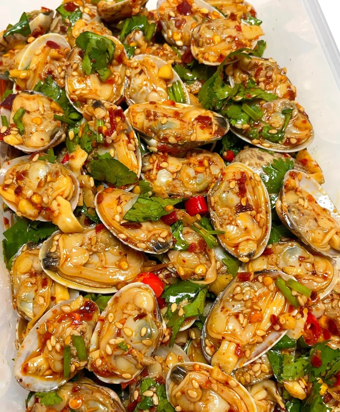 凉拌花甲。花甲焯水和酱料腌制好凉拌后就可以开吃了,味道Q弹满嘴鲜。