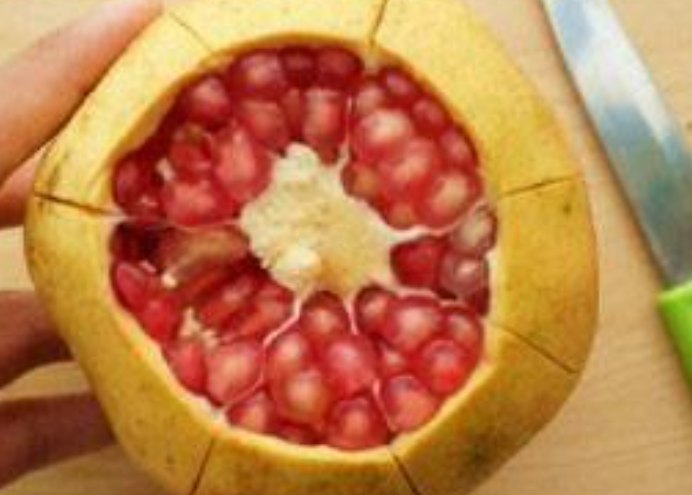石榴洗净,用刀切去上下两头,划破凸起的地方,掰开就可以吃了。
