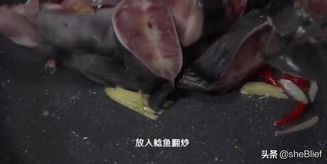 2、锅中倒油,放入葱丝,姜丝,蒜,辣椒爆香,放入鲶鱼翻炒。