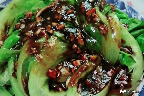 5、今天生粉放多了一点,太稠了。把酱料浇在焯好水的生菜上,可以上桌开吃了,方便易学,味道脆爽甘甜,大人小孩都喜欢吃。