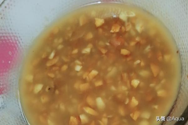 3、把大蒜籽去此剁碎,再加蚝油,生粉,白糖,少量清水,搅拌成淀粉水。